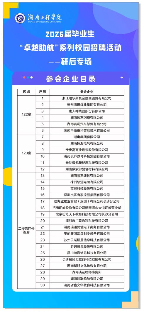 12月23日14:30在新校区图书馆122室、123室、二报告厅外连廊,举办“研后专场”,招聘需求涵盖我校所有专业!
