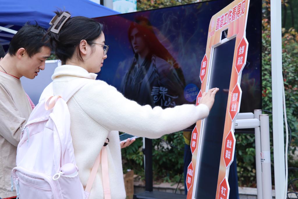 活动现场特设“智慧求职区”,四个智能电子屏同步开放,求职者可通过关键词搜索快速匹配心仪岗位,并直接进行线上面试,实现“指尖求职”。线下同步开启的直播通道吸引超千人次在线观看,主播实时介绍岗位信息、互动答疑,将招聘会辐射至更广泛人群。