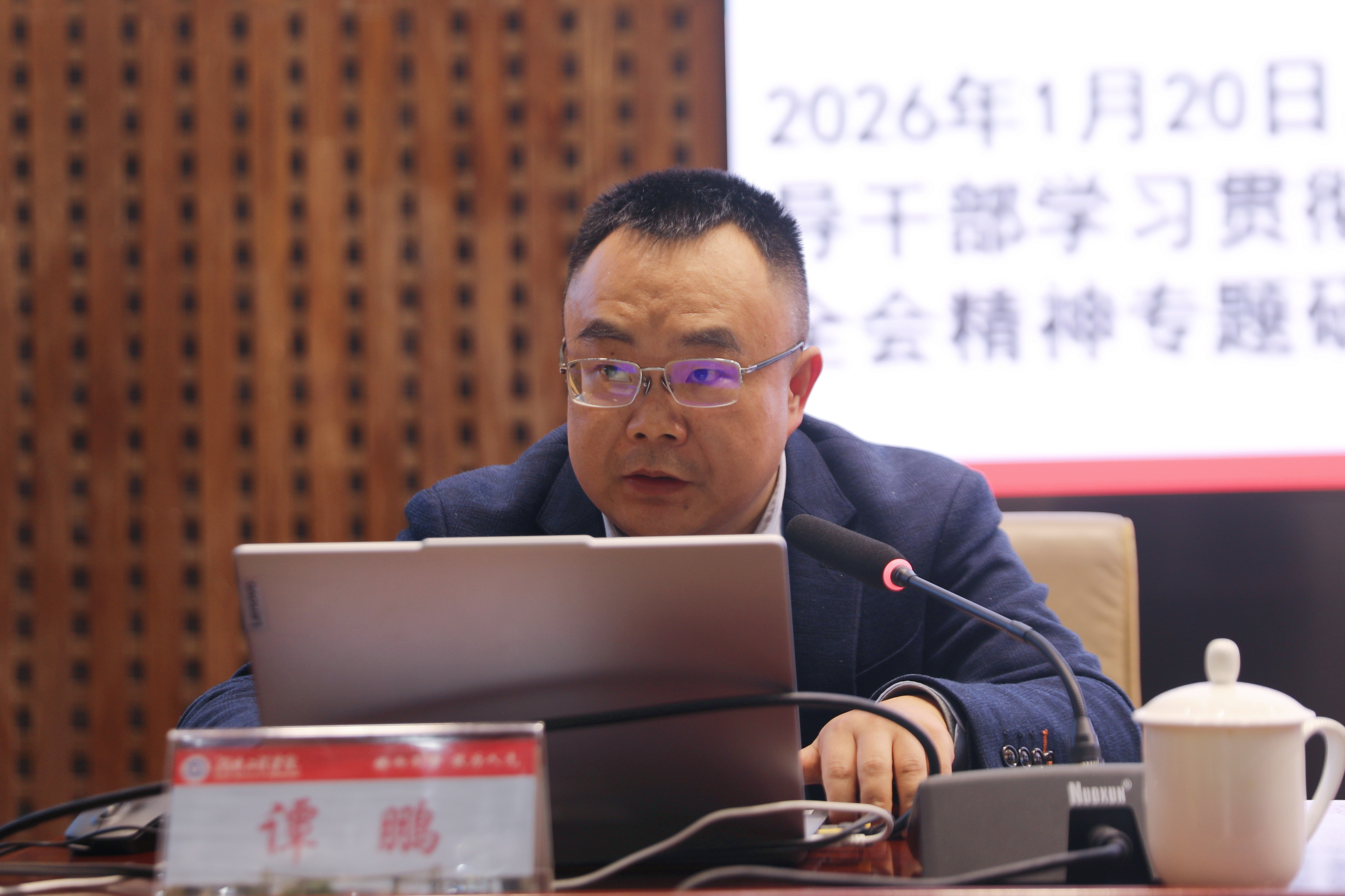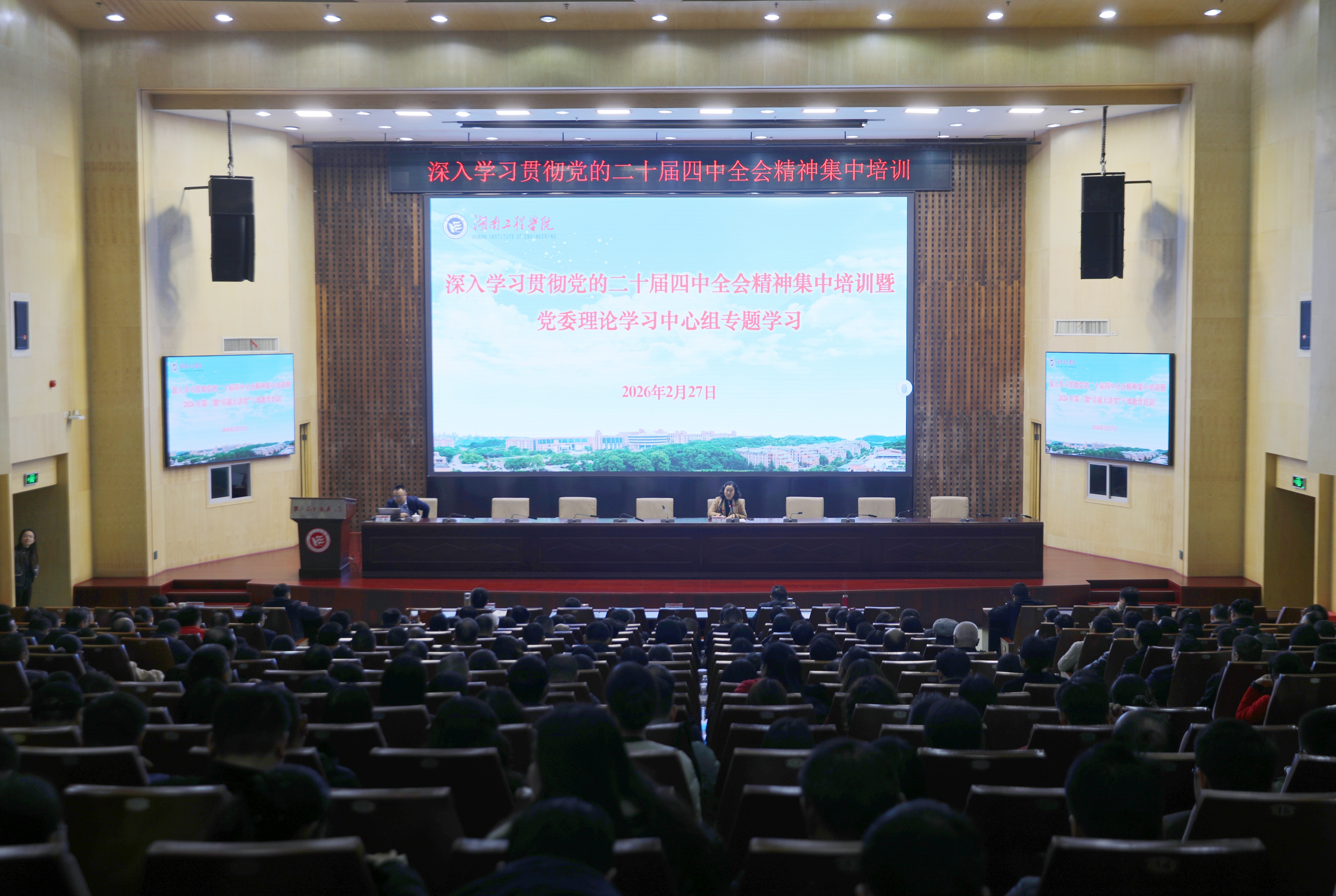 2月27日下午,湖南工程学院深入学习贯彻党的二十届四中全会精神集中培训在一报告厅举行,湖南省委党校党史党建教研部副主任谭鹏应邀作专题辅导报告。我院全体中层干部、科级干部及党支部书记参加,这同时也是学院党委理论学习中心组2026年度第二次专题学习。